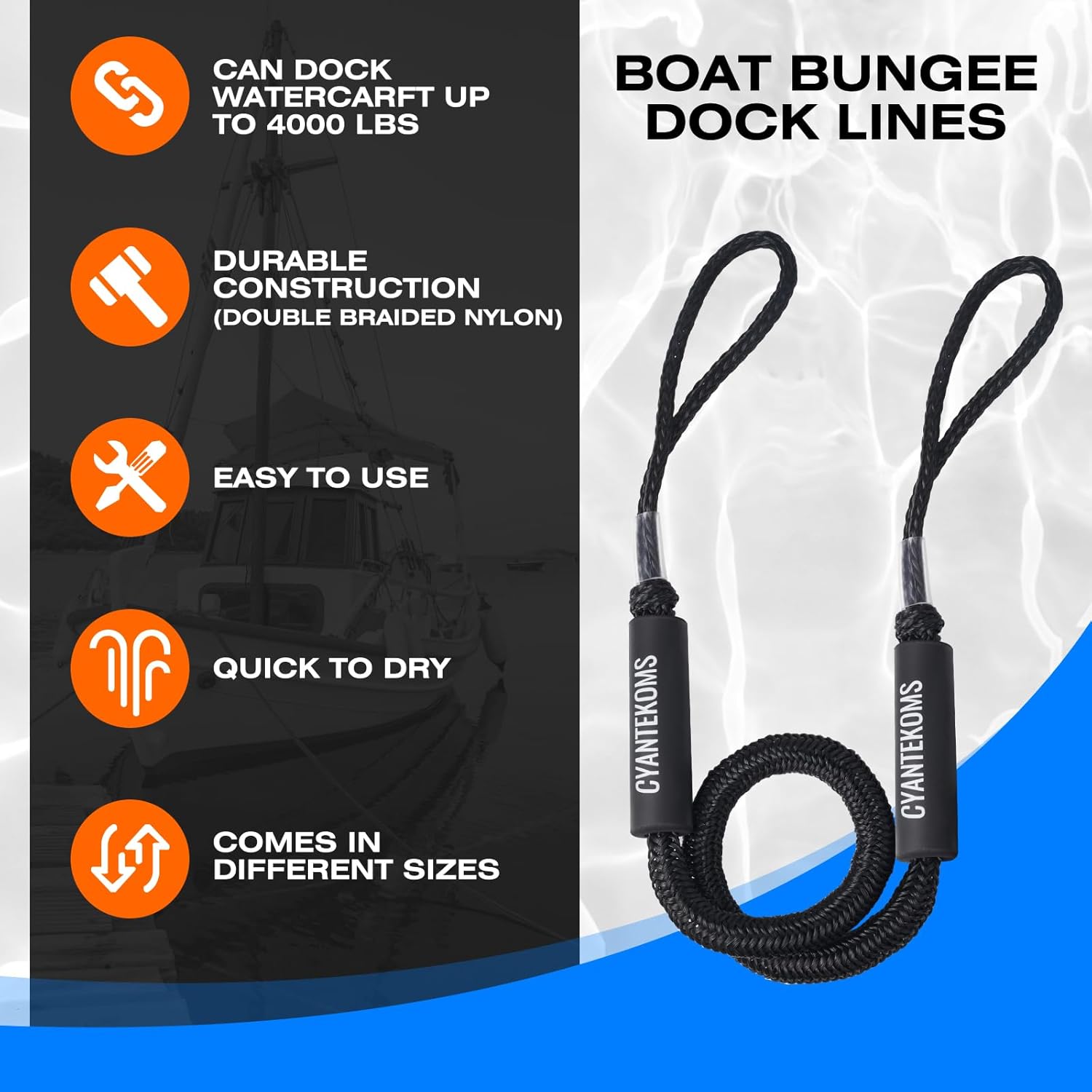 Our bungee dock line greatly eliminates the jerking and tugging on your docked boat caused by non-bungee dock lines.Perfect for Docking,Kayak,Watercraft,Jet Ski,Pontoon,Canoe.